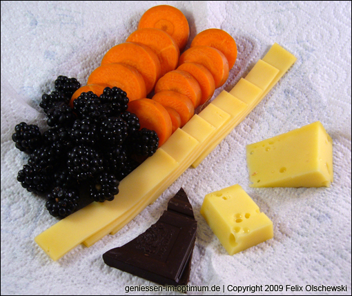 Eine gesunde und ausgewogene Möglichkeit, einfach mal etwas zu naschen: Beeren, Möhren, Käse und Schokolade. Der Gouda harmoniert gut mit der sehr dunklen Schokolade, die Möhren sind knackig und die Beeren süß – es ist also für jeden etwas dabei.