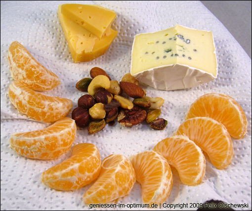 Ein Snack für die Adventswochen: Mandarinen und Nüsse sind schon beinahe Tradition in der Vorweihnachtszeit. Dazu zwei sehr schmackhafte und sich gut ergänzende Käse: Ein würziger Blauschimmel und ein pikanter, gut gereifter Gouda.