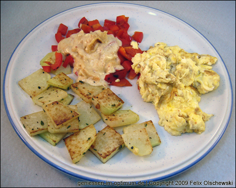 Häufig werde ich gefragt, ob ich denn gar keine Kartoffeln mehr esse. Nun, grundsätzlich habe ich nichts gegen gute Kartoffeln. Allerdings ist ihr Kohlenhydratgehalt so hoch, daß ich davon einfach nicht satt werde. Daher entwickele ich mehr und mehr Alternativen – die mir zusehends besser gefallen als Kartoffeln. Dies habe ich bereits beim Rezept für Bratsellerie mit Spiegelei gezeigt. Und auch heute sind die ursprünglichen Bratkartoffeln wieder Grundlage für meine Inspiration gewesen: