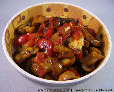 Zunächst die Zwiebel kleinschneiden und mit Salz und Pfeffer glasig braten, dann die Champignons hinzugeben und schmoren, dabei ebenfalls salzen und pfeffern. Anschliessend einen Schuss Milch hinzugeben, verrühren und dann die in sehr kleine Stückchen geschnittene Paprika hinzugeben. Die Milch nimmt den Geschmack des Zwiebel-Pilz-Gemischs auf und gibt ihn an die Paprika weiter, sorgt darüberhinaus für eine saftige Konsistenz.