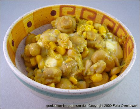 Hier wird zunächst die Zwiebel glasig gebraten, der recht schnell die Champignons folgen, die etwas brauner gebraten werden sollten, als auf dem Foto zu sehen. Gewürzt werden muss schon hier mit Salz und Pfeffer und -natürlich- Curry. Im Anschluss einfach die Bohnen, den Mais und den kleingeschnittenen Käse hinzugeben und sorgfältig abschmecken: Weiße Bohnen bringen oft nicht viel Eigengeschmack mit und benötigen etwas mehr Fürsorge und Gewürz.