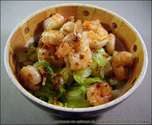 Den Wirsing mit Salz, Pfeffer, Muskat und etwas Butter abschmecken. Die Garnelen auf dem Wirsing anrichten und servieren.