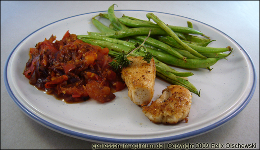 Die Buschbohnen ca 15-20 Minuten dünsten, dabei mit Salz, Pfeffer und Bohnenkraut würzen.