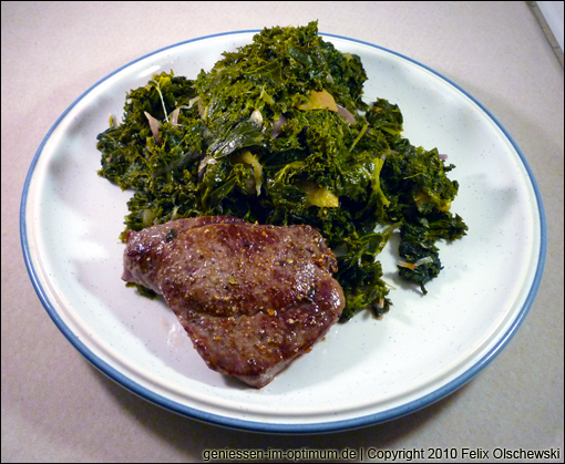 Das ausgesprochen zarte Fleisch des Hirschsteaks verträgt sich ausgezeichnet mit dem zur winterlichen Jahreszeit passenden Grünkohl. Der Aufwand bei der Zubereitung frischen Grünkohls ist im Vergleich zur Verarbeitung von Konservenware zweifelsohne größer – doch dies zahlt sich durch den wesentlich besseren Geschmack mehrfach aus.