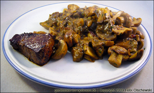Eine Mischung aus frischen Steinpilzen und Champignons ist auch zu einem Hirschsteak äusserst geniessbar. Einen unterschiedlich intensiven Geschmack im Vergleich besonders großer mit besonders kleinen Pilzen konnte ich übrigens nicht feststellen und so darf auf dem Markt auch ruhig zu der günstigeren Variante gegriffen werden.