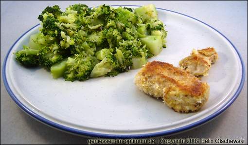 Den Brokkoli zerkleinern und mit etwas Wasser in einen Topf geben, ca 10 Minuten garen/dünsten. Mit Salz, Pfeffer und Muskat würzen.