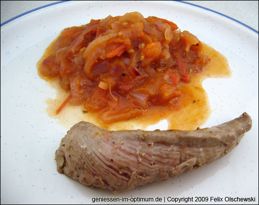 Kurz vor dem servieren einfach das Lammfilet in einer heißen Pfanne von allen Seiten scharf anbraten und dabei mit etwas Salz und Pfeffer würzen. Ich empfehle, das Lamm nicht zu lange und somit „Medium“ zu braten.