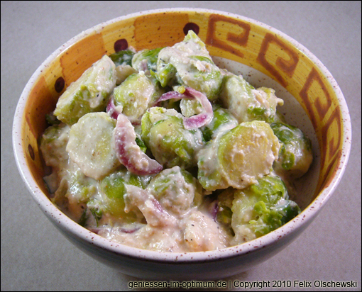 Den fertig gekochten Rosenkohl abgießen und zur Soße geben. Gut umrühren und abschmecken.