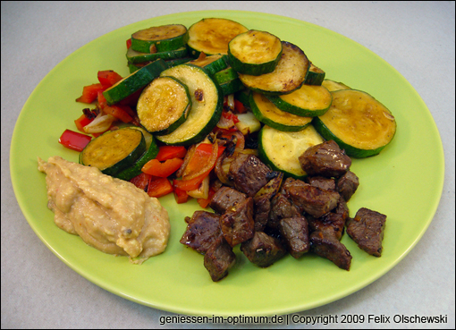 Eine sehr einfache und erfolgsträchtige Zubereitungsart für Rindfleisch ist das Sautieren kleiner Stücke. Dabei wird nur höchstens so viel Fleisch in die Pfanne gegeben, dass alles nebeneinander liegen kann. Das Fleisch ist sehr schnell gar und wird nur äusserst selten zäh. Die kleinen Stücke sind ausserdem leicht verzehrbar. Mit etwas gedünstetem Gemüse entsteht so ein leichtes und unkompliziertes Gericht. Wer mag, reicht dazu eine Guacamole.