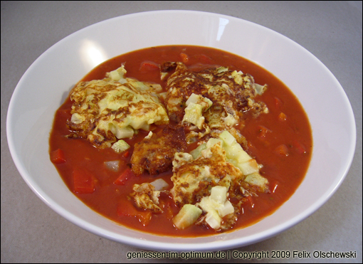 Auch Zone-gerechte Suppen lassen sich schnell und einfach kochen. Ob nun auf Basis von Brühen, Cremes oder–wie hier–passierten Tomaten: Mit den entsprechenden Zutaten wird eine schmackhafte und sättigende Speise daraus.